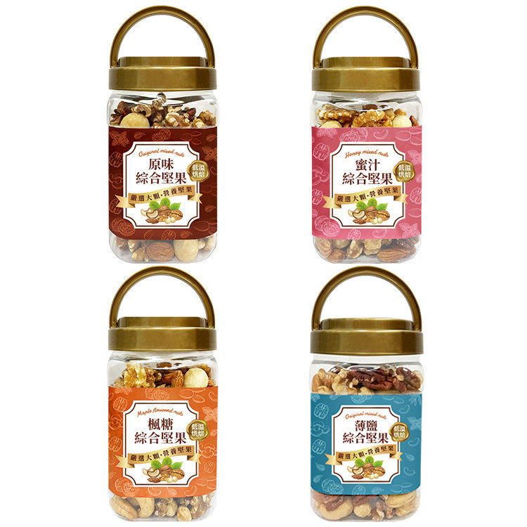 成 份: 杏仁果、核桃、腰果、榛果、胡桃、夏威夷豆、砂糖、麥芽糖