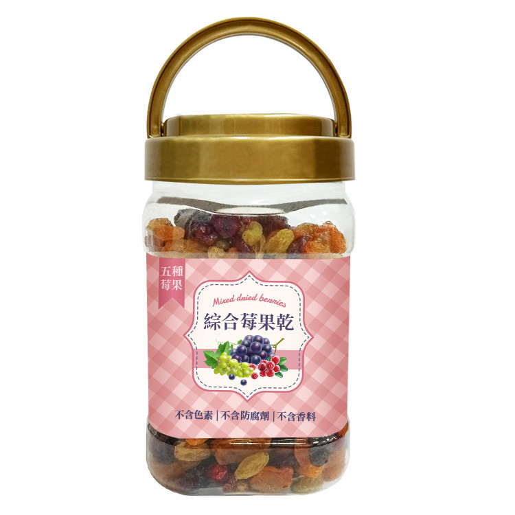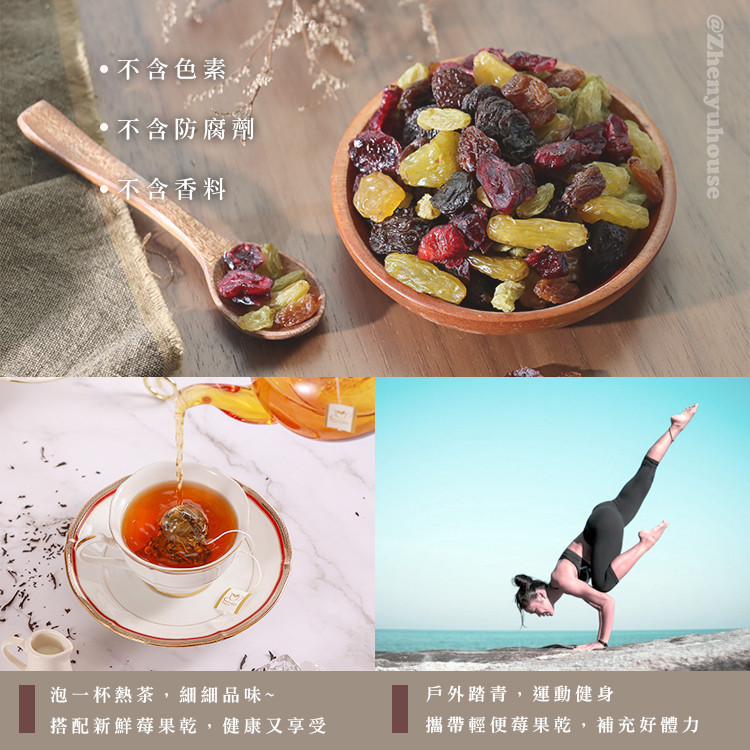 成 份: 紅葡萄乾、青堤子葡萄乾、金黃葡萄乾、蔓越莓、無籽葡萄乾、糖、葵花油、亞硫酸鈉
